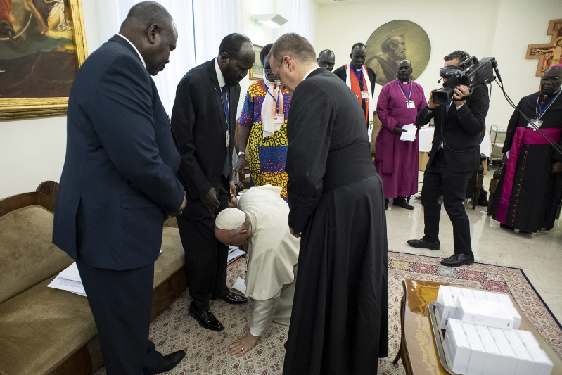 Các nhà lãnh đạo Nam Sudan bàng hoàng khi Đức Giáo Hoàng Francis, nay đã 82 tuổi và bị yếu chân, được các phụ tá giúp để ngài quỳ xuống và hôn lên chân của hai nhà lãnh đạo đối nghịch cùng một số người khác trong căn phòng.
